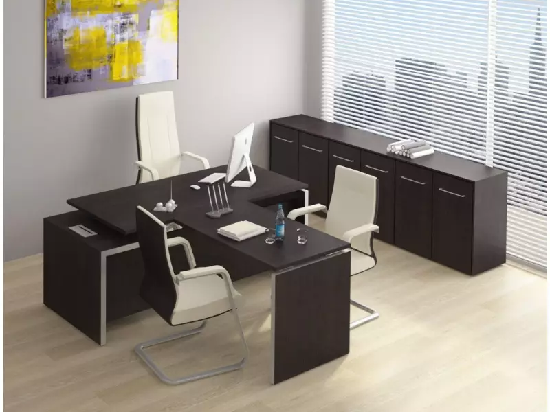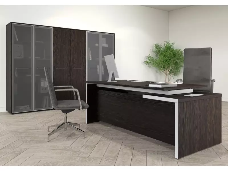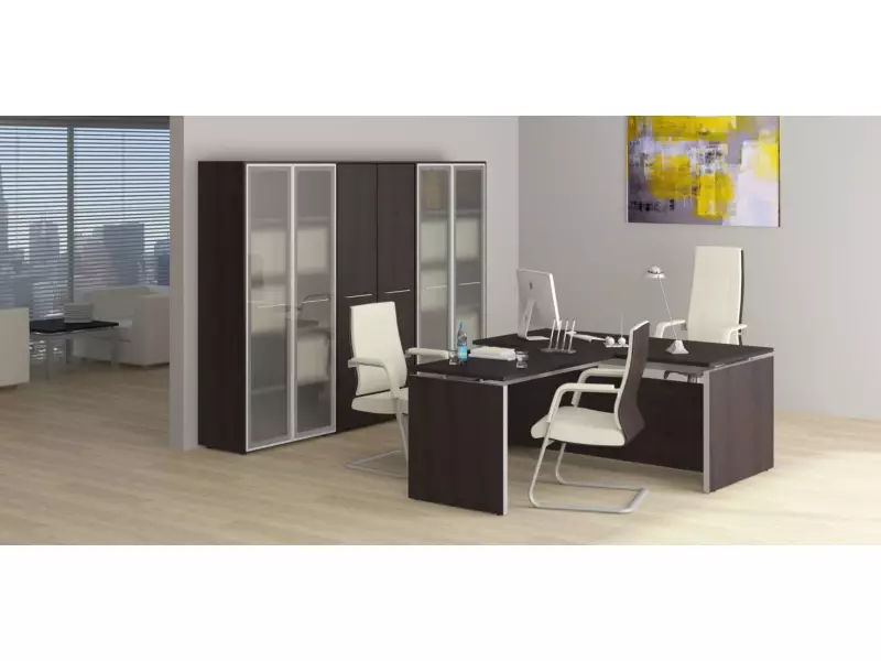 Кабинет REVENTON создан в стиле функционального минимализма. Главной изюминкой в дизайне данной серии офисной мебели стала оригинальная L- образная конструкция, которая используется в качестве опоры рабочего стола. Цвет отделки кабинета – неповторимый и бесконечно благородный «песочный зебрано». Стоит отметить, что в предстоящем сезоне светлые тона в интерьере остаются на пике моды. Еще один современный штрих – боковые торцы опор декорированы алюминиевой кромкой.