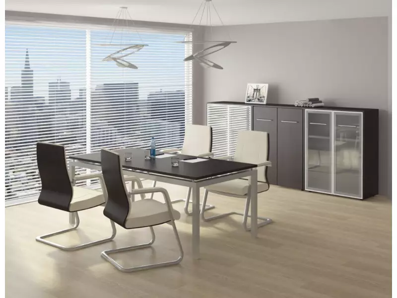С помощью оптических эффектов, построенных на контрасте, меняется восприятие пространства. Декоративные элементы цилиндрической формы между столешницей и опорами создают ощущение невесомости и свободного парения поверхности рабочего стола. Опорная тумба рабочего стола с жестким соединением к боковой брифинг-приставке, напротив, вносит в конструкцию элемент фундаментальности и приземленности.