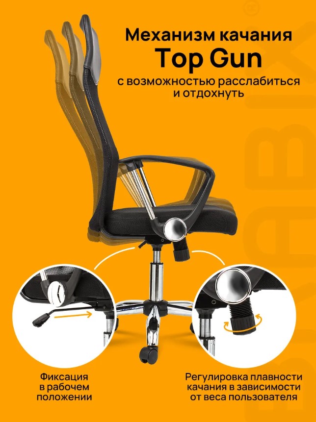Кресло оснащено механизмом качания «топ-ган» с регулировкой под вес пользователя и возможностью фиксации спинки в рабочем положении.