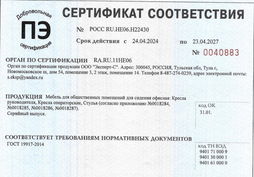 Кресло прошло добровольную сертификацию, поэтому мы уверены в качестве товара!